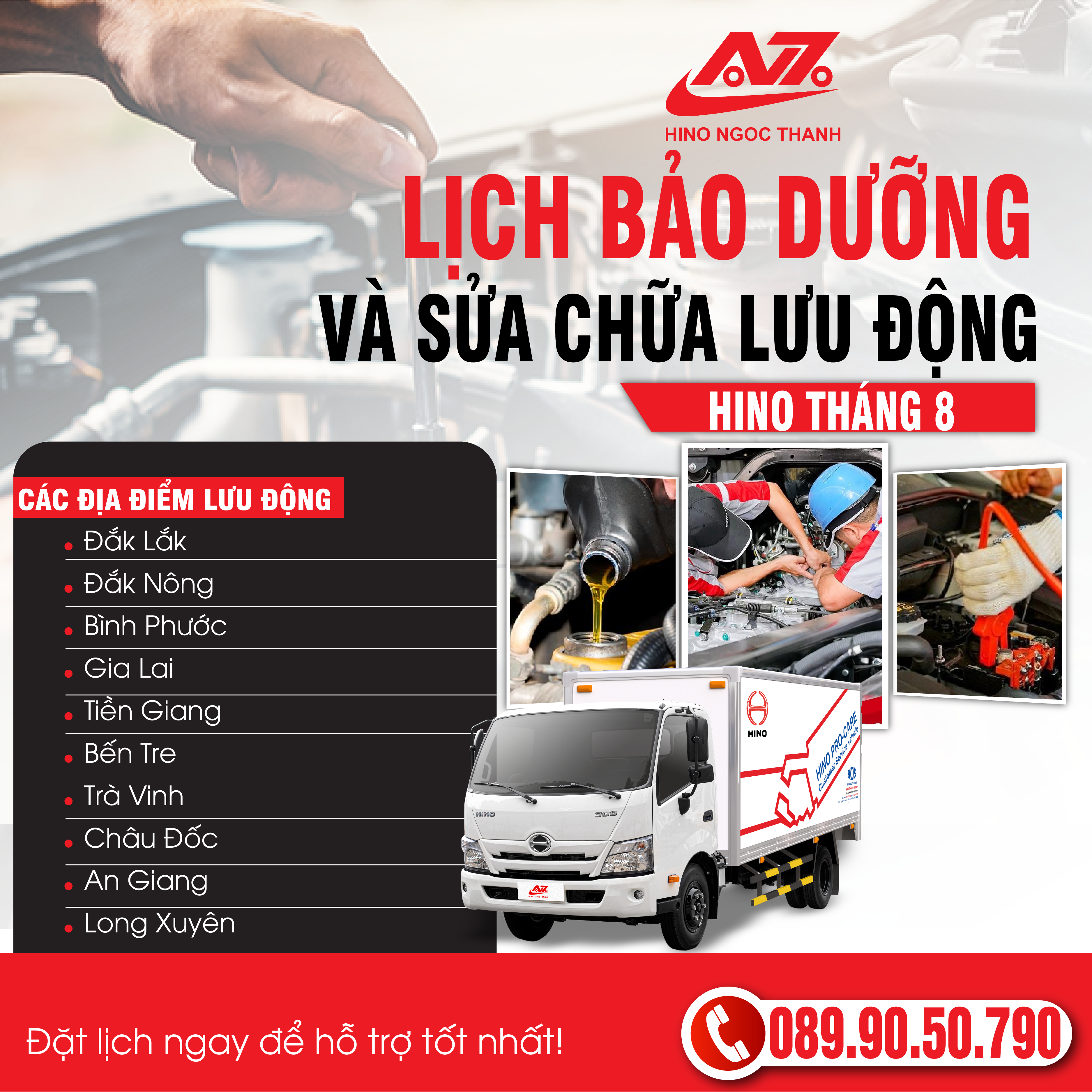 Hino Ngọc Thành chính thức khởi động chuỗi sự kiện Caravan Hino , mang dịch vụ bảo dưỡng – sửa chữa lưu động đến tận nơi cho Quý khách tại 10 tỉnh thành: Địa điểm lưu động: Đắk Lắk – Đắk Nông – Bình Phước – Gia Lai – Kon Tum – Tiền Giang…