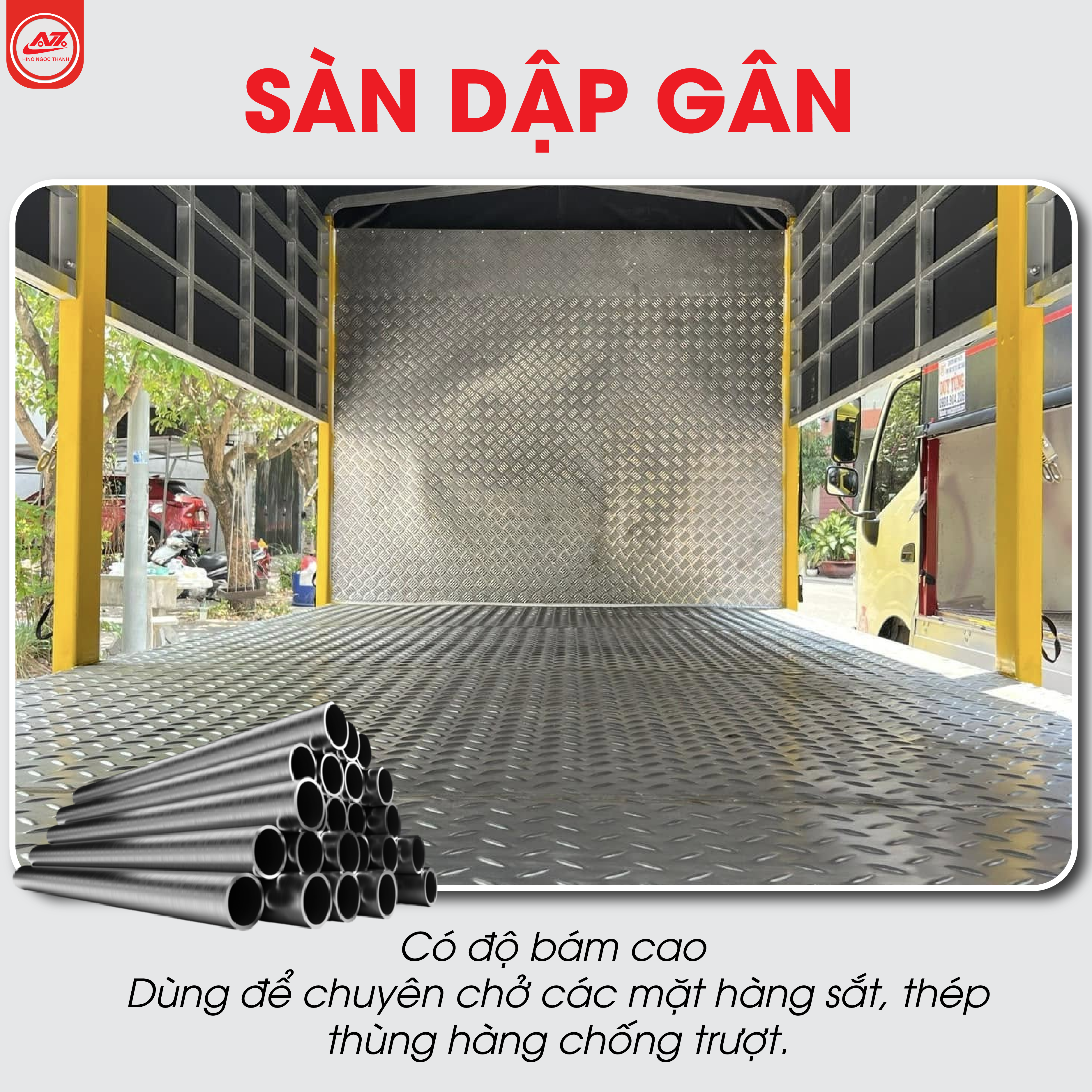 Thích hợp để chở thép ống, thép hộp, thùng hàng nặng hoặc các loại bồn, thiết bị cần chống trượt.