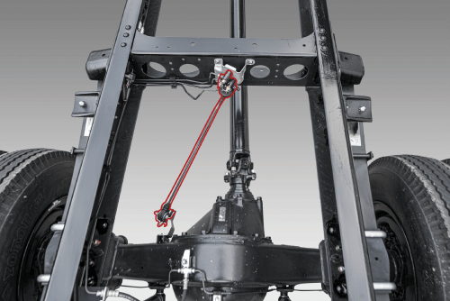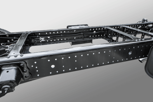 Khung gầm nhập khẩu từ Nhật Bản, làm từ thép nguyên khối không mối nối, cực kỳ chắc chắn. Hệ thống lỗ đồng đều trên chassis giúp việc đóng thùng hoặc lắp phụ kiện thêm trở nên đơn giản. Cầu lớn đúc nguyên khối với bộ vi‑sai ổn định, kết hợp nhíp đa lá hình bán nguyệt và giảm xóc thủy lực giúp xe vận hành êm ái, giảm xóc và rung giật ngay cả trên đường xấu.