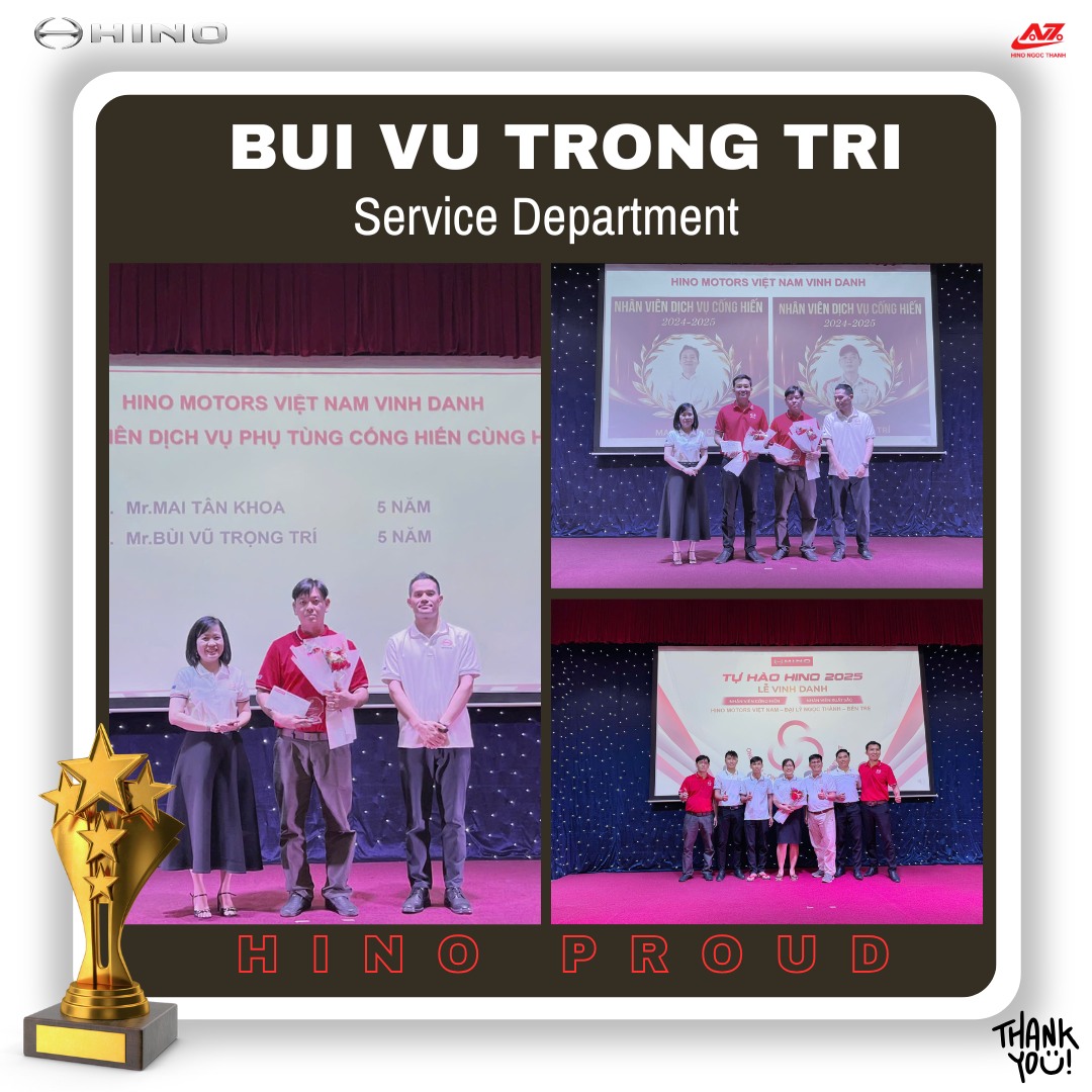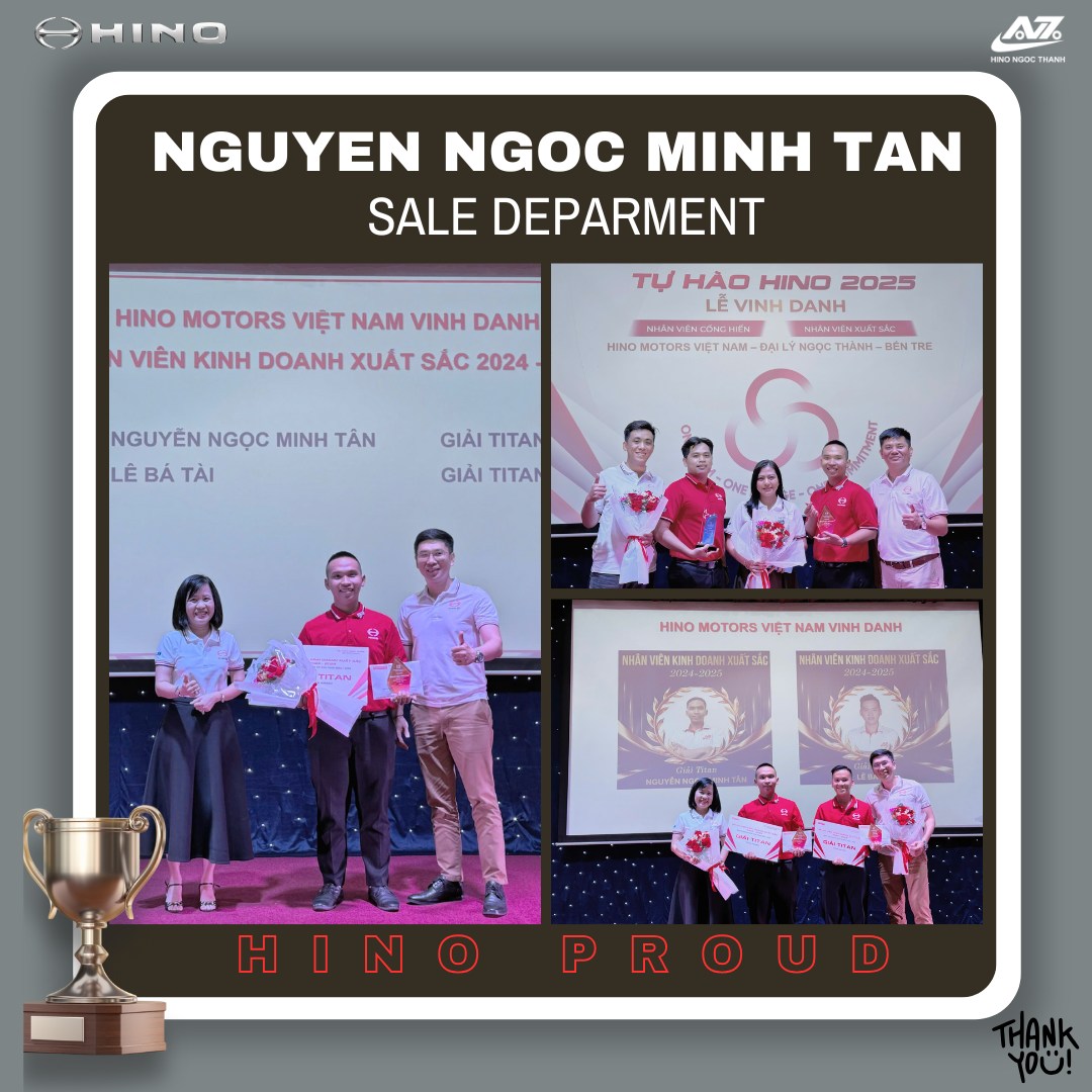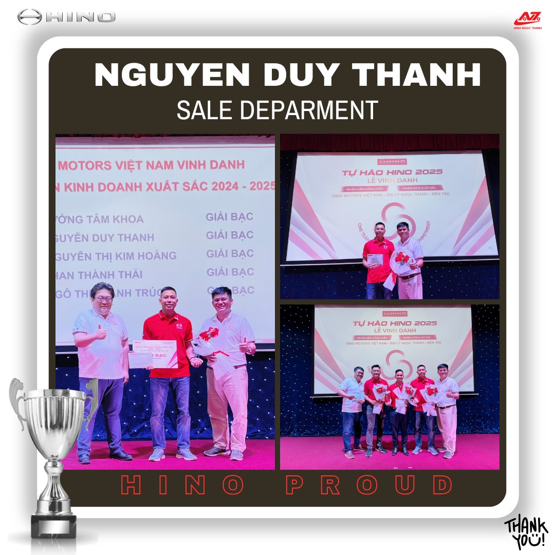 Tại chương trình TỰ HÀO HINO 2025 do Hino Motors Việt Nam tổ chức, tập thể Hino Ngọc Thành – Bến Tre vinh dự có nhiều cá nhân thuộc phòng Kinh Doanh và phòng Dịch Vụ được vinh danh với thành tích nổi bật trong năm 2024–2025.
