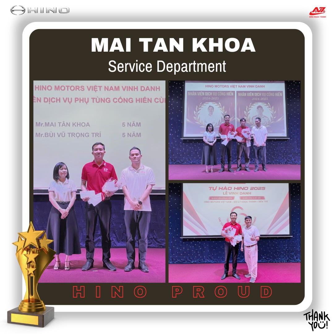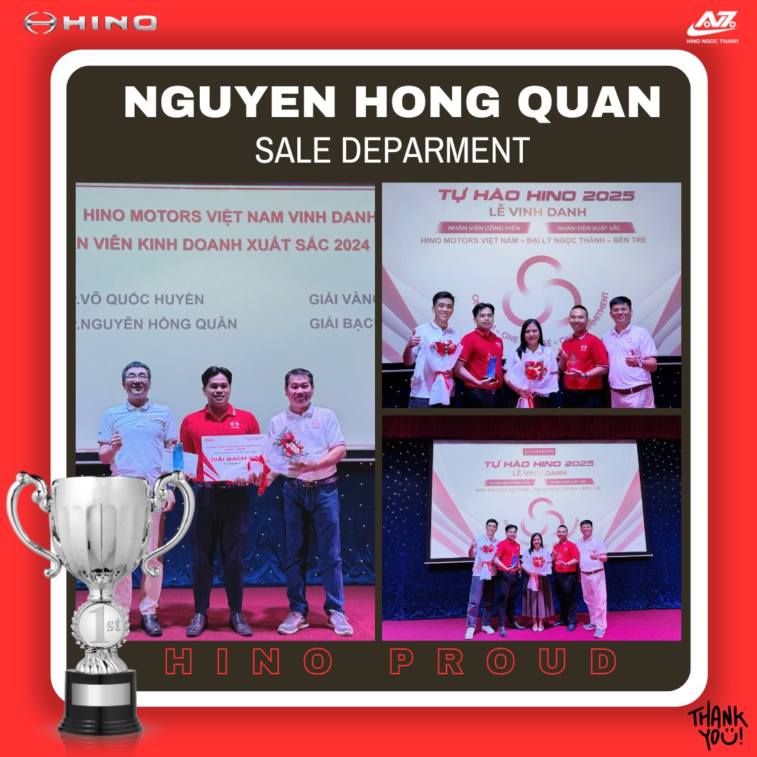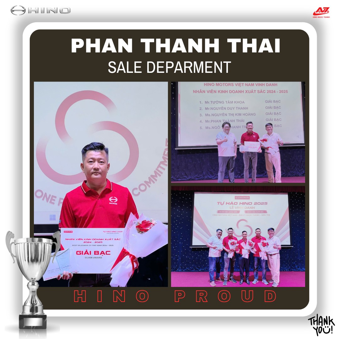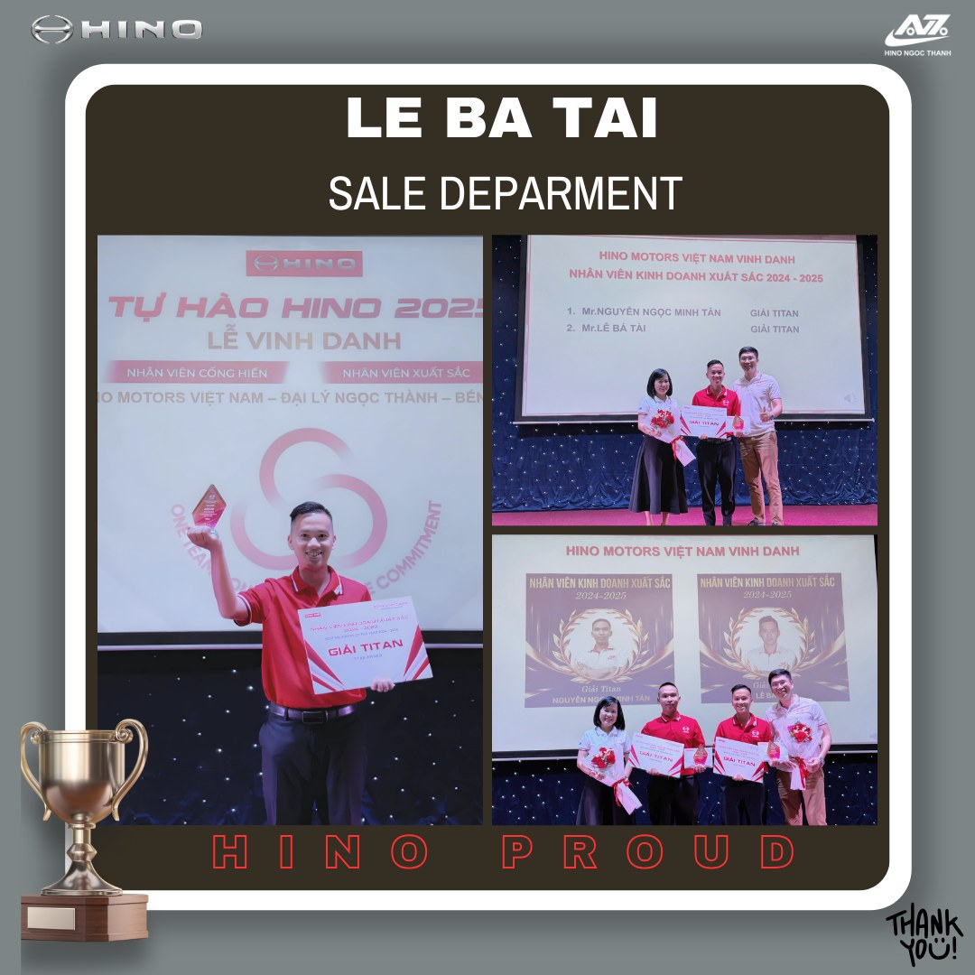 Tại chương trình TỰ HÀO HINO 2025 do Hino Motors Việt Nam tổ chức, tập thể Hino Ngọc Thành – Bến Tre vinh dự có nhiều cá nhân thuộc phòng Kinh Doanh và phòng Dịch Vụ được vinh danh với thành tích nổi bật trong năm 2024–2025.